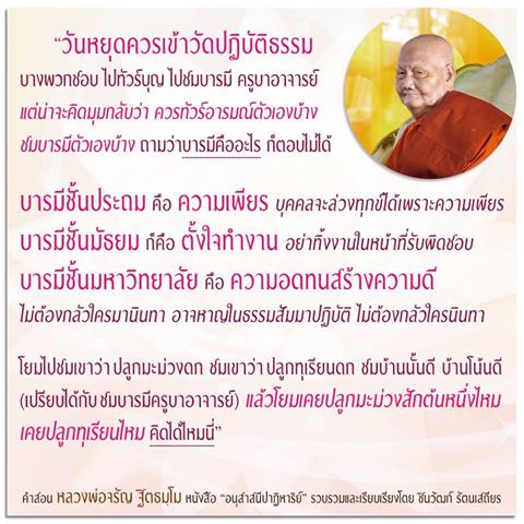 "วันหยุดควรเข้าวัดปฏิบัติธรรม บางพวกชอบ ไปทัวร์บุญ ไปชมบารมี ครูบาอาจารย์ แต่น่าจะคิดมุมกลับว่า ควรทัวร์อารมณ์ตัวเองบ้าง ชมบารมีตัวเองบ้าง ถามว่าบารมีคืออะไร ก็ตอบไม่ได้